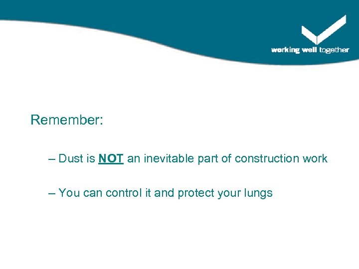 Remember: – Dust is NOT an inevitable part of construction work – You can control it and protect your lungs