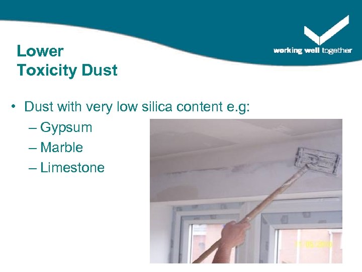 Lower Toxicity Dust • Dust with very low silica content e. g: – Gypsum – Marble – Limestone