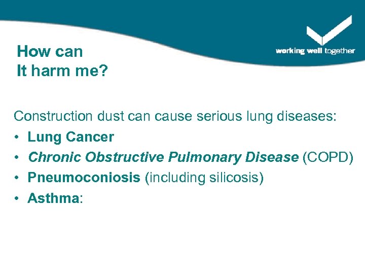 How can It harm me? Construction dust can cause serious lung diseases: • Lung Cancer • Chronic Obstructive Pulmonary Disease (COPD) • Pneumoconiosis (including silicosis) • Asthma: