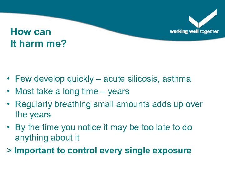 How can It harm me? • Few develop quickly – acute silicosis, asthma • Most take a long time – years • Regularly breathing small amounts adds up over the years • By the time you notice it may be too late to do anything about it > Important to control every single exposure