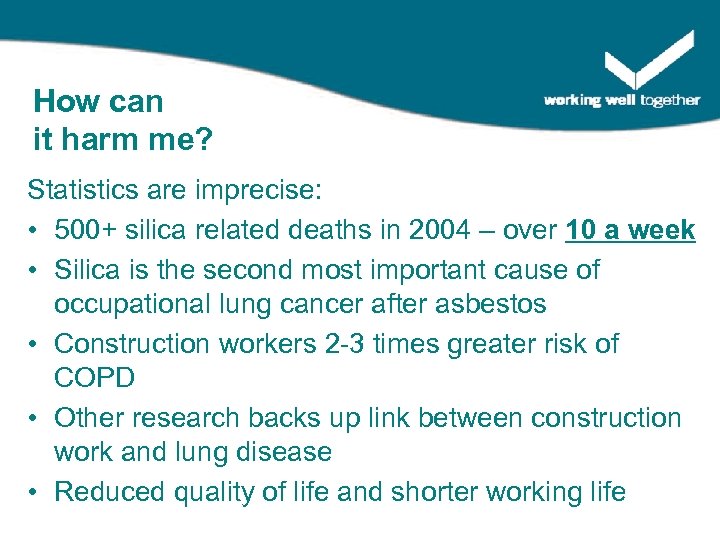 How can it harm me? Statistics are imprecise: • 500+ silica related deaths in 2004 – over 10 a week • Silica is the second most important cause of occupational lung cancer after asbestos • Construction workers 2 -3 times greater risk of COPD • Other research backs up link between construction work and lung disease • Reduced quality of life and shorter working life