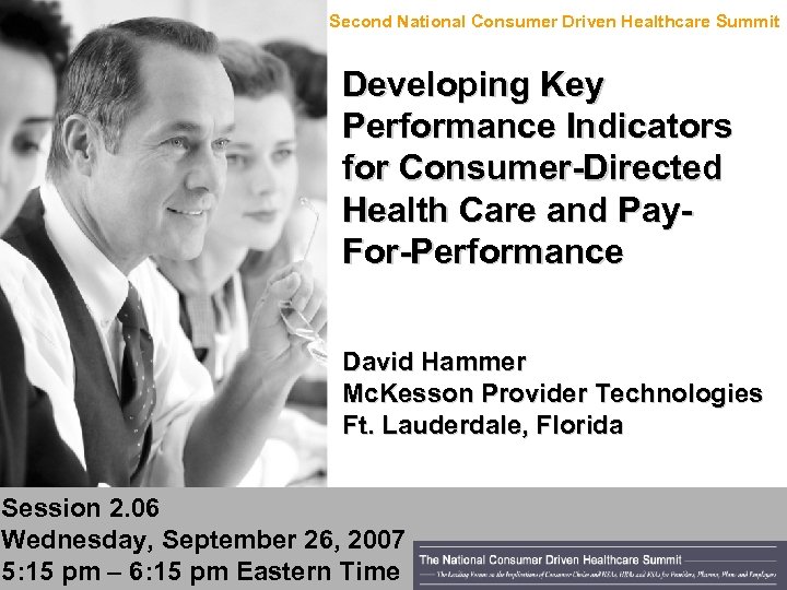Consumer Driven Healthcare Summit 2007 Second National Consumer Driven Healthcare Summit Developing Key Performance Indicators for Consumer-Directed Health Care and Pay. For-Performance David Hammer Mc. Kesson Provider Technologies Ft. Lauderdale, Florida Session 2. 06 Wednesday, September 26, 2007 Developing KPIs 6: 15 pm 5: 15 pm –for CDHC and P 4 PEastern Time 1