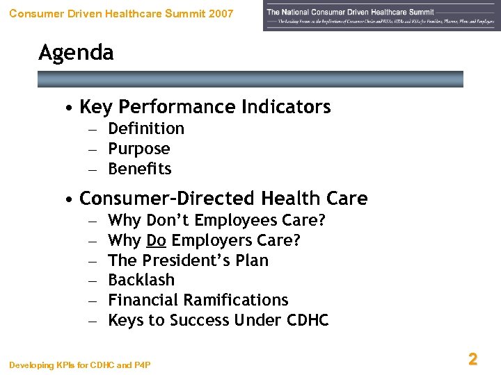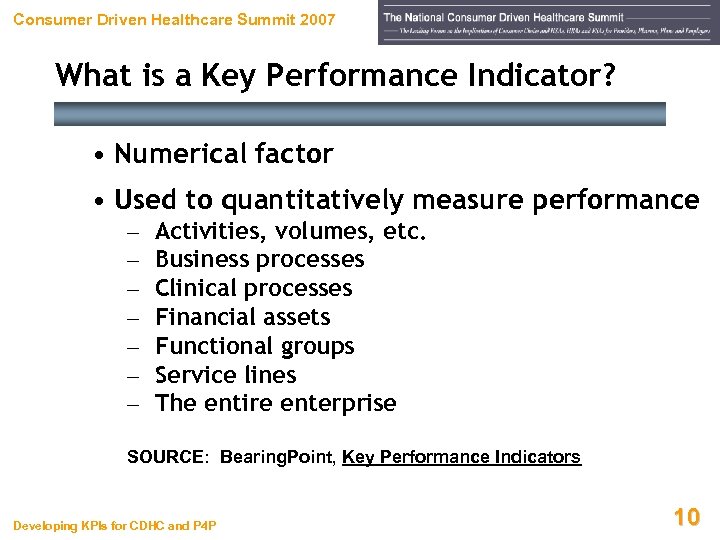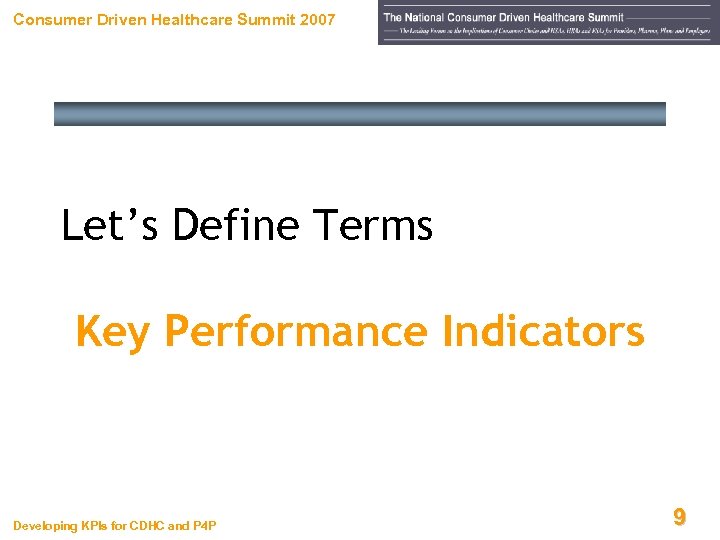 Consumer Driven Healthcare Summit 2007 Let’s Define Terms Key Performance Indicators Developing KPIs for CDHC and P 4 P 9
