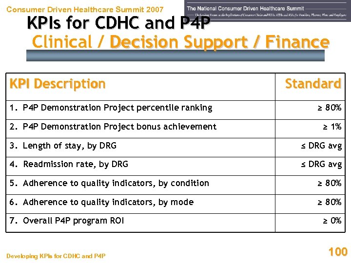 Consumer Driven Healthcare Summit 2007 KPIs for CDHC and P 4 P Clinical / Decision Support / Finance KPI Description Standard 1. P 4 P Demonstration Project percentile ranking ≥ 80% 2. P 4 P Demonstration Project bonus achievement ≥ 1% 3. Length of stay, by DRG ≤ DRG avg 4. Readmission rate, by DRG ≤ DRG avg 5. Adherence to quality indicators, by condition ≥ 80% 6. Adherence to quality indicators, by mode ≥ 80% 7. Overall P 4 P program ROI Developing KPIs for CDHC and P 4 P ≥ 0% 100