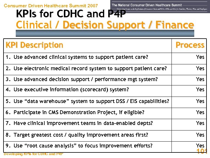 Consumer Driven Healthcare Summit 2007 KPIs for CDHC and P 4 P Clinical / Decision Support / Finance KPI Description Process 1. Use advanced clinical systems to support patient care? Yes 2. Use electronic medical record system to support patient care? Yes 3. Use advanced decision support / performance mgt system? Yes 4. Use executive information (scorecard) system? Yes 5. Use “data warehouse” system to support DSS / EIS capabilities? Yes 6. Participate in CMS Demonstration Project, if eligible? Yes 7. Have clinical improvement teams in data-enabled depts? Yes 8. Target greatest cost / quality improvement areas first? Yes 9. Use “root cause analysis” to focus improvement efforts? Yes Developing KPIs for CDHC and P 4 P 101