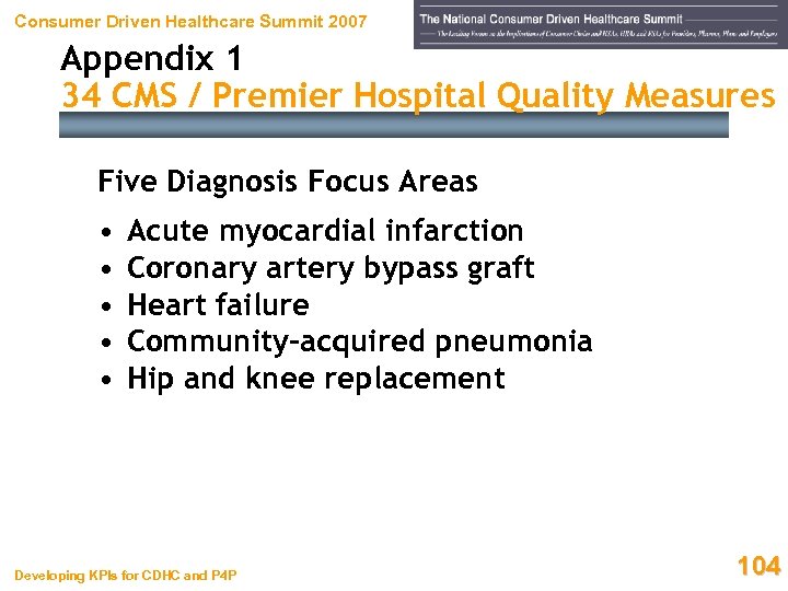Consumer Driven Healthcare Summit 2007 Appendix 1 34 CMS / Premier Hospital Quality Measures Five Diagnosis Focus Areas • • • Acute myocardial infarction Coronary artery bypass graft Heart failure Community-acquired pneumonia Hip and knee replacement Developing KPIs for CDHC and P 4 P 104