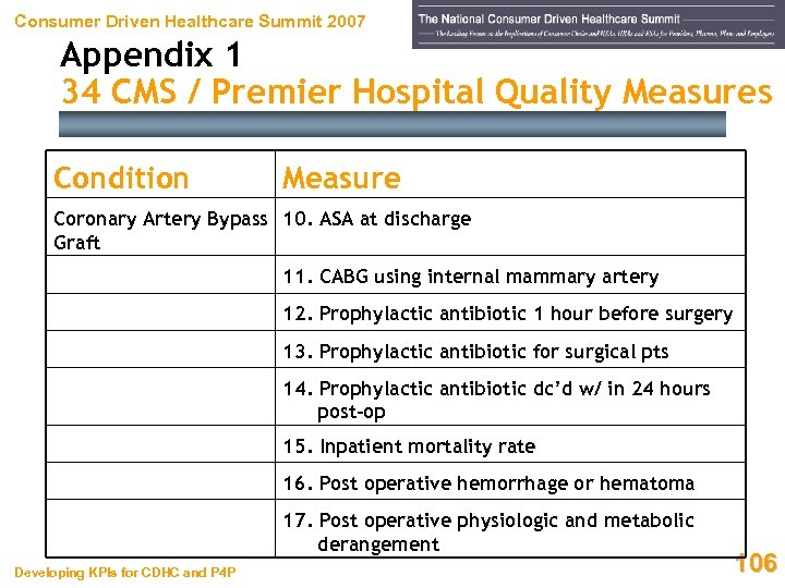 Consumer Driven Healthcare Summit 2007 Appendix 1 34 CMS / Premier Hospital Quality Measures Condition Measure Coronary Artery Bypass 10. ASA at discharge Graft 11. CABG using internal mammary artery 12. Prophylactic antibiotic 1 hour before surgery 13. Prophylactic antibiotic for surgical pts 14. Prophylactic antibiotic dc’d w/ in 24 hours post-op 15. Inpatient mortality rate 16. Post operative hemorrhage or hematoma 17. Post operative physiologic and metabolic derangement Developing KPIs for CDHC and P 4 P 106