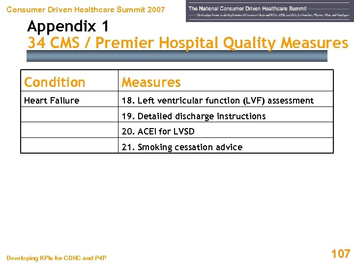 Consumer Driven Healthcare Summit 2007 Appendix 1 34 CMS / Premier Hospital Quality Measures Condition Measures Heart Failure 18. Left ventricular function (LVF) assessment 19. Detailed discharge instructions 20. ACEI for LVSD 21. Smoking cessation advice Developing KPIs for CDHC and P 4 P 107