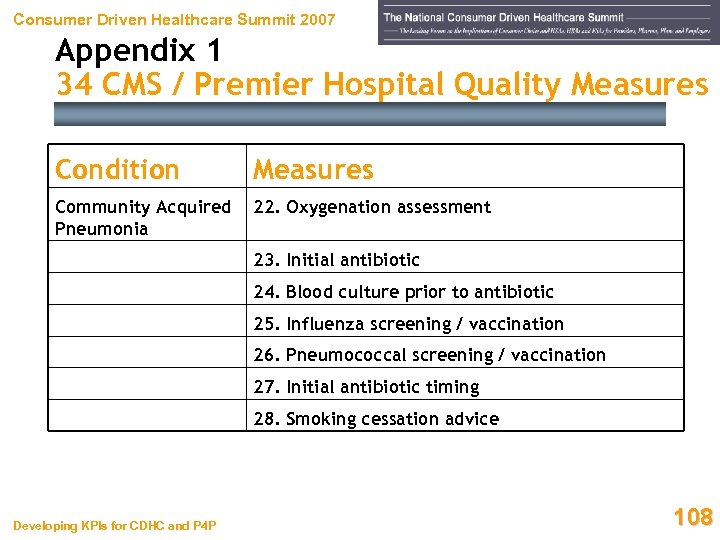 Consumer Driven Healthcare Summit 2007 Appendix 1 34 CMS / Premier Hospital Quality Measures Condition Measures Community Acquired Pneumonia 22. Oxygenation assessment 23. Initial antibiotic 24. Blood culture prior to antibiotic 25. Influenza screening / vaccination 26. Pneumococcal screening / vaccination 27. Initial antibiotic timing 28. Smoking cessation advice Developing KPIs for CDHC and P 4 P 108
