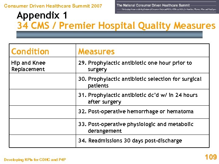 Consumer Driven Healthcare Summit 2007 Appendix 1 34 CMS / Premier Hospital Quality Measures Condition Measures Hip and Knee Replacement 29. Prophylactic antibiotic one hour prior to surgery 30. Prophylactic antibiotic selection for surgical patients 31. Prophylactic antibiotic dc’d w/ in 24 hours after surgery 32. Post-operative hemorrhage or hematoma 33. Post-operative physiologic and metabolic derangement 34. Readmissions 30 days post-discharge Developing KPIs for CDHC and P 4 P 109