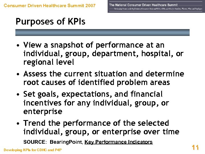 Consumer Driven Healthcare Summit 2007 What is a Key Performance Indicator? • Numerical factor • Used to quantitatively measure performance – – – – Activities, volumes, etc. Business processes Clinical processes Financial assets Functional groups Service lines The entire enterprise SOURCE: Bearing. Point, Key Performance Indicators Developing KPIs for CDHC and P 4 P 10
