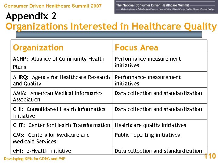 Consumer Driven Healthcare Summit 2007 Appendix 2 Organizations Interested in Healthcare Quality Organization Focus Area ACHP: Alliance of Community Health Performance measurement initiatives Plans AHRQ: Agency for Healthcare Research Performance measurement and Quality initiatives AMIA: American Medical Informatics Association Data collection and standardization CHI: Consolidated Health Informatics Initiative Data collection and standardization CHT: Center for Health Transformation Healthcare quality initiatives CMS: Centers for Medicare and Medicaid Services Public reporting initiatives e. HI: e-Health Initiative Data collection and standardization Developing KPIs for CDHC and P 4 P 110