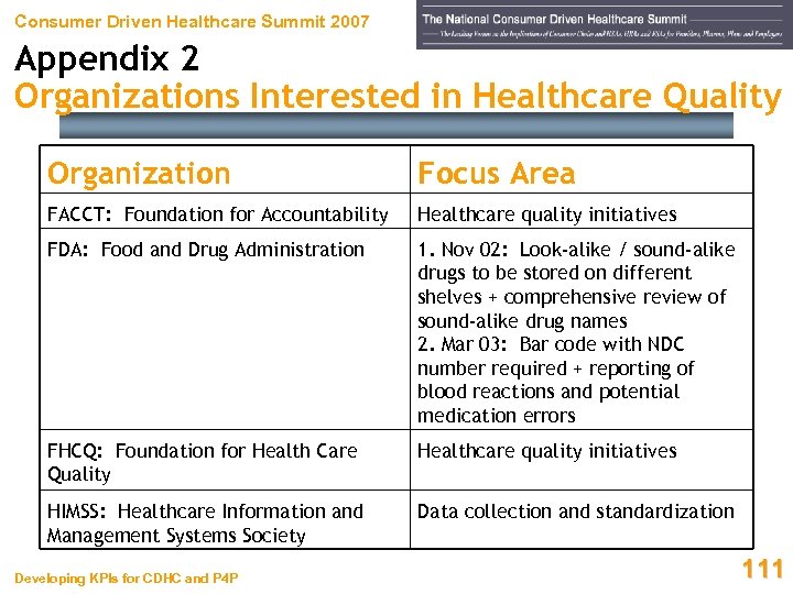 Consumer Driven Healthcare Summit 2007 Appendix 2 Organizations Interested in Healthcare Quality Organization Focus Area FACCT: Foundation for Accountability Healthcare quality initiatives FDA: Food and Drug Administration 1. Nov 02: Look-alike / sound-alike drugs to be stored on different shelves + comprehensive review of sound-alike drug names 2. Mar 03: Bar code with NDC number required + reporting of blood reactions and potential medication errors FHCQ: Foundation for Health Care Quality Healthcare quality initiatives HIMSS: Healthcare Information and Management Systems Society Data collection and standardization Developing KPIs for CDHC and P 4 P 111