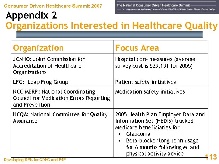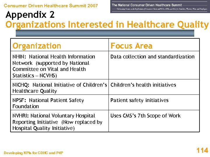 Consumer Driven Healthcare Summit 2007 Appendix 2 Organizations Interested in Healthcare Quality Organization Focus Area JCAHO: Joint Commission for Accreditation of Healthcare Organizations Hospital core measures (average survey cost is $29, 191 for 2005) LFG: Leap Frog Group Patient safety initiatives NCC MERP: National Coordinating Council for Medication Errors Reporting and Prevention Medication safety initiatives NCQA: National Committee for Quality Assurance 2005 Health Plan Employer Data and Information Set (HEDIS) tracked Medicare beneficiaries for • Glaucoma • Beta-blocker long term usage for 6 months following MI and physical activity advice Developing KPIs for CDHC and P 4 P 113