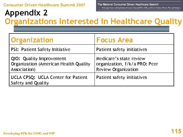 Consumer Driven Healthcare Summit 2007 Appendix 2 Organizations Interested in Healthcare Quality Organization Focus Area NHIN: National Health Information Network (supported by National Committee on Vital and Health Statistics – NCVHS) Data collection and standardization NICHQ: National Initiative of Children’s health initiatives Healthcare Quality NPSF: National Patient Safety Foundation Patient safety initiatives NVHRI: National Voluntary Hospital Reporting Initiative (Now replaced by Hospital Quality Initiative) Uses CMS’s 7 th Scope of Work Developing KPIs for CDHC and P 4 P 114