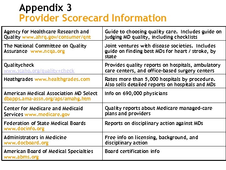 Appendix 3 Provider Scorecard Information Agency for Healthcare Research and Quality www. ahrq. gov/consumer/qnt Guide to choosing quality care. Includes guide on judging MD quality, including checklists The National Committee on Quality Assurance www. ncqa. org Joint ventures with disease societies. Includes guide on finding best MDs for heart / stroke, by state Qualitycheck www. jcaho. org/quality+check Provides quality reports on hospitals, ambulatory care centers, and office-based surgery centers Heathgrades www. healthgrades. com Rates more than 5, 000 hospitals by procedure. Also sells detailed reports on hospitals and MDs American Medical Association MD Select dbapps. ama-assn. org/aps/amahg. htm Info on 690, 000 physicians Center for Medicare and Medicaid Services www. medicare. gov Quality reports about Medicare managed-care plans and providers Federation of State Medical Boards www. docinfo. org Reports on disciplinary action against MDs Administrators in Medicine www. docboard. org Free info on licensing, background, and disciplinary action American Board of Medical Specialties www. abms. org Board certification info