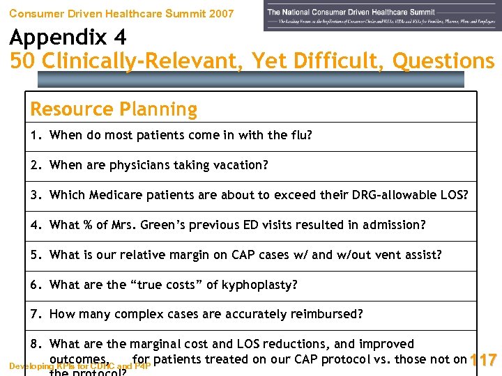 Consumer Driven Healthcare Summit 2007 Appendix 4 50 Clinically-Relevant, Yet Difficult, Questions Resource Planning 1. When do most patients come in with the flu? 2. When are physicians taking vacation? 3. Which Medicare patients are about to exceed their DRG-allowable LOS? 4. What % of Mrs. Green’s previous ED visits resulted in admission? 5. What is our relative margin on CAP cases w/ and w/out vent assist? 6. What are the “true costs” of kyphoplasty? 7. How many complex cases are accurately reimbursed? 8. What are the marginal cost and LOS reductions, and improved outcomes, for patients treated on our CAP protocol vs. those not on 117 Developing KPIs for CDHC and P 4 P