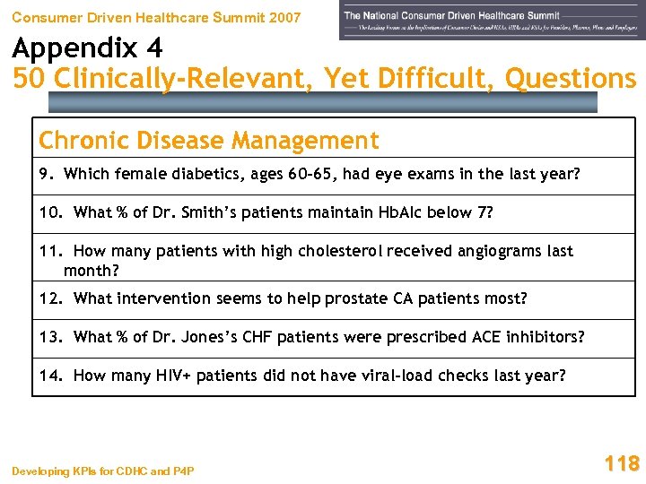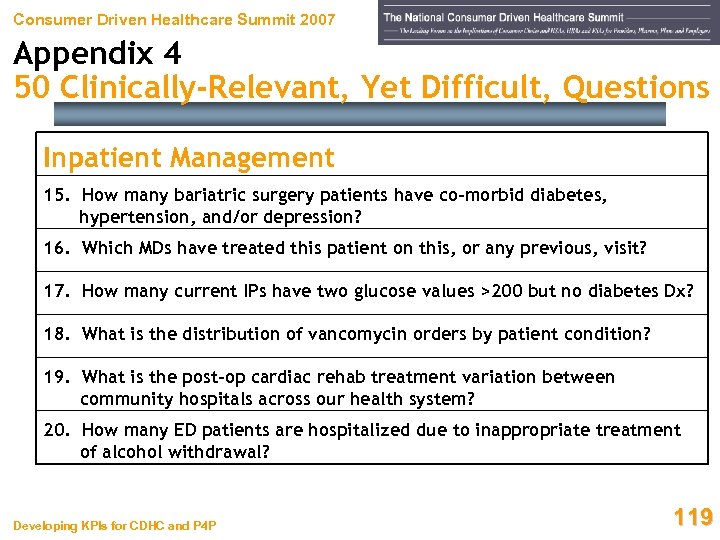 Consumer Driven Healthcare Summit 2007 Appendix 4 50 Clinically-Relevant, Yet Difficult, Questions Chronic Disease Management 9. Which female diabetics, ages 60 -65, had eye exams in the last year? 10. What % of Dr. Smith’s patients maintain Hb. AIc below 7? 11. How many patients with high cholesterol received angiograms last month? 12. What intervention seems to help prostate CA patients most? 13. What % of Dr. Jones’s CHF patients were prescribed ACE inhibitors? 14. How many HIV+ patients did not have viral-load checks last year? Developing KPIs for CDHC and P 4 P 118