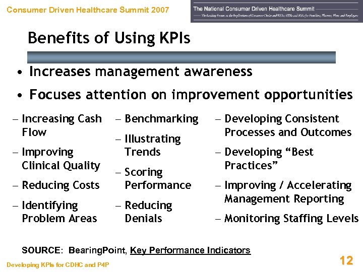 Consumer Driven Healthcare Summit 2007 Purposes of KPIs • View a snapshot of performance at an individual, group, department, hospital, or regional level • Assess the current situation and determine root causes of identified problem areas • Set goals, expectations, and financial incentives for any individual, group, or enterprise • Trend the performance of the selected individual, group, or enterprise over time SOURCE: Bearing. Point, Key Performance Indicators Developing KPIs for CDHC and P 4 P 11 11