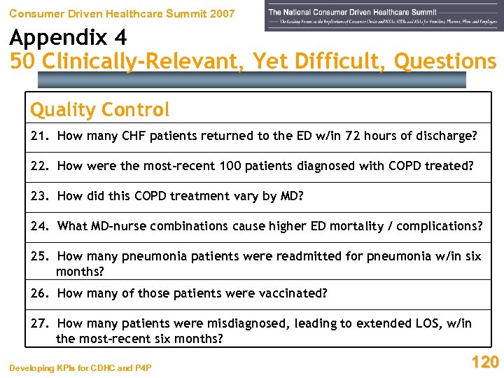 Consumer Driven Healthcare Summit 2007 Appendix 4 50 Clinically-Relevant, Yet Difficult, Questions Quality Control 21. How many CHF patients returned to the ED w/in 72 hours of discharge? 22. How were the most-recent 100 patients diagnosed with COPD treated? 23. How did this COPD treatment vary by MD? 24. What MD-nurse combinations cause higher ED mortality / complications? 25. How many pneumonia patients were readmitted for pneumonia w/in six months? 26. How many of those patients were vaccinated? 27. How many patients were misdiagnosed, leading to extended LOS, w/in the most-recent six months? Developing KPIs for CDHC and P 4 P 120
