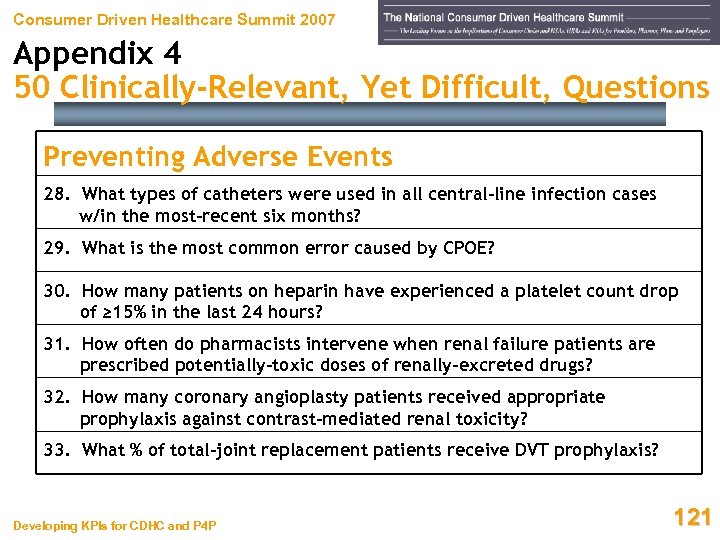 Consumer Driven Healthcare Summit 2007 Appendix 4 50 Clinically-Relevant, Yet Difficult, Questions Preventing Adverse Events 28. What types of catheters were used in all central-line infection cases w/in the most-recent six months? 29. What is the most common error caused by CPOE? 30. How many patients on heparin have experienced a platelet count drop of ≥ 15% in the last 24 hours? 31. How often do pharmacists intervene when renal failure patients are prescribed potentially-toxic doses of renally-excreted drugs? 32. How many coronary angioplasty patients received appropriate prophylaxis against contrast-mediated renal toxicity? 33. What % of total-joint replacement patients receive DVT prophylaxis? Developing KPIs for CDHC and P 4 P 121