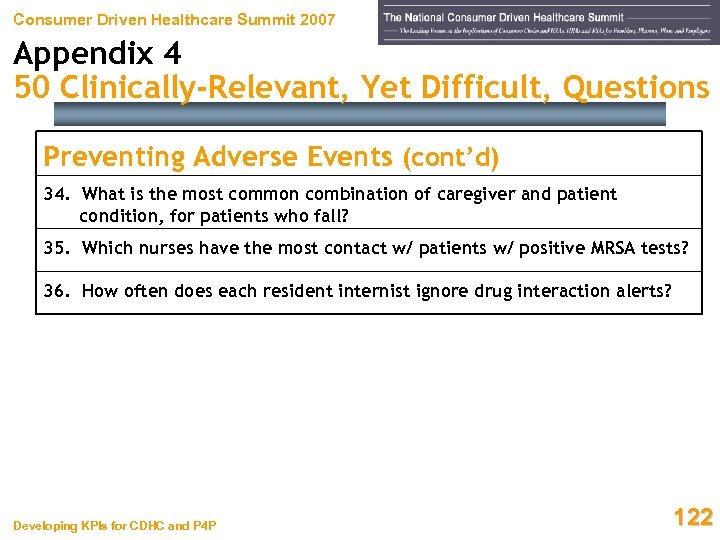 Consumer Driven Healthcare Summit 2007 Appendix 4 50 Clinically-Relevant, Yet Difficult, Questions Preventing Adverse Events (cont’d) 34. What is the most common combination of caregiver and patient condition, for patients who fall? 35. Which nurses have the most contact w/ patients w/ positive MRSA tests? 36. How often does each resident internist ignore drug interaction alerts? Developing KPIs for CDHC and P 4 P 122