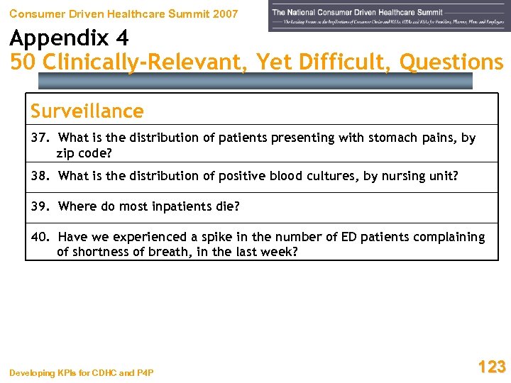 Consumer Driven Healthcare Summit 2007 Appendix 4 50 Clinically-Relevant, Yet Difficult, Questions Surveillance 37. What is the distribution of patients presenting with stomach pains, by zip code? 38. What is the distribution of positive blood cultures, by nursing unit? 39. Where do most inpatients die? 40. Have we experienced a spike in the number of ED patients complaining of shortness of breath, in the last week? Developing KPIs for CDHC and P 4 P 123