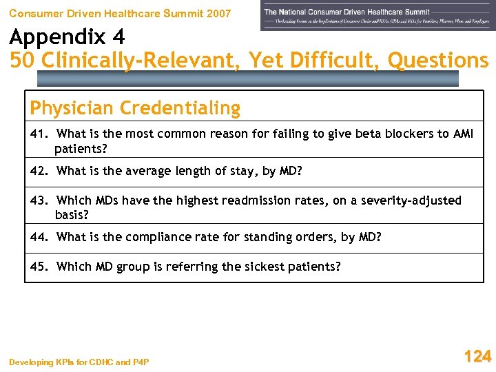 Consumer Driven Healthcare Summit 2007 Appendix 4 50 Clinically-Relevant, Yet Difficult, Questions Physician Credentialing 41. What is the most common reason for failing to give beta blockers to AMI patients? 42. What is the average length of stay, by MD? 43. Which MDs have the highest readmission rates, on a severity-adjusted basis? 44. What is the compliance rate for standing orders, by MD? 45. Which MD group is referring the sickest patients? Developing KPIs for CDHC and P 4 P 124