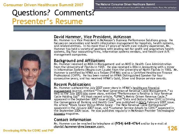Consumer Driven Healthcare Summit 2007 Questions? Comments? Presenter’s Resume David Hammer, Vice President, Mc. Kesson Mr. Hammer is a Vice President in Mc. Kesson’s Business Performance Solutions group. He focuses on receivables and health information management for hospitals, health systems, and related entities. In his more than 21 years of health care industry experience, Mr. Hammer has held a variety of positions with leading not-for-profit and proprietary health systems, Big Four accounting firms, information systems vendors, and health care A/R management companies. Background and Affiliations Mr. Hammer received an MBA in Management and an MHS in Health Care Administration from the University of Florida in 1987. He also received a BBA in Accounting with a minor in Information Systems (Magna cum Laude) from the University of North Florida in 1985. Mr. Hammer is certified by HFMA as a Fellow (FHFMA) and as a Certified Healthcare Finance Professional (CHFP). He has been named an HFMA Distinguished Speaker four consecutive years, and has received HFMA’s Gold, Silver and Bronze service awards. Recent Publications Mr. Hammer authored the July 2007 cover story in HFMA’s healthcare financial management journal, entitled “The Next Generation of Revenue Cycle Management, ” as well as the July 2005 hfm cover story, entitled “Performance is Reality: Is Your Revenue Cycle Holding Up? ” His most-recent article, “UPMC’s Metric-Driven Revenue Cycle, ” appeared in the September 2007 issue of hfm, and “Data and Dollars: How CDHC is Driving the Convergence of Banking and Health Care” was published in hfm’s February 2007 issue. His article “Black Space Versus White Space – The New Revenue Cycle Battleground” appeared in the January 2007 issue, and “Customer Service Adapts to CDHC” appeared in the September 2006 issue. He also publishes regularly in Mc. Kesson Provider Technologies’ Answers magazine. Contact Information Mr. Hammer can be reached by telephone at (954) 648 -4764 and/or by e-mail at david. hammer@mckesson. com. Developing KPIs for CDHC and P 4 P 126