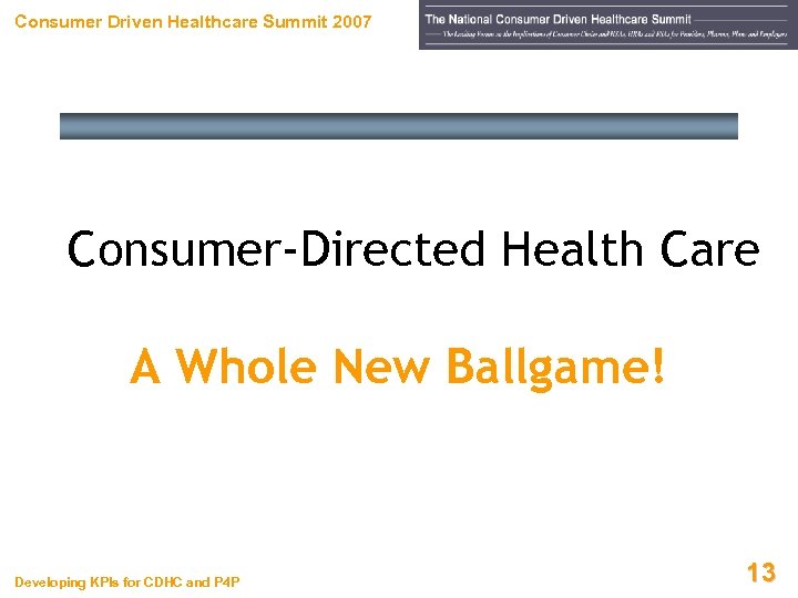 Consumer Driven Healthcare Summit 2007 Consumer-Directed Health Care A Whole New Ballgame! Developing KPIs for CDHC and P 4 P 13