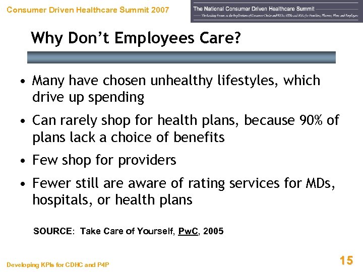 Consumer Driven Healthcare Summit 2007 Medical Consumerism Coming “Managed care was designed to put control where there was none. Today’s trend towards consumerism attempts to inject something that’s been missing from health benefits – a consumer who cares more about cost and quality. ” SOURCE: Take Care of Yourself – Employers Embrace Consumerism to Control Healthcare Costs, Pricewaterhouse. Coopers’ Health Research Institute, 2005 Developing KPIs for CDHC and P 4 P 14