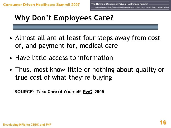 Consumer Driven Healthcare Summit 2007 Why Don’t Employees Care? • Many have chosen unhealthy lifestyles, which drive up spending • Can rarely shop for health plans, because 90% of plans lack a choice of benefits • Few shop for providers • Fewer still are aware of rating services for MDs, hospitals, or health plans SOURCE: Take Care of Yourself, Pw. C, 2005 Developing KPIs for CDHC and P 4 P 15