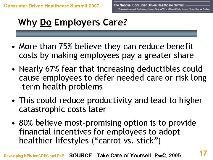 Consumer Driven Healthcare Summit 2007 Why Don’t Employees Care? • Almost all are at least four steps away from cost of, and payment for, medical care • Have little access to information • Thus, most know little or nothing about quality or true cost of what they’re buying SOURCE: Take Care of Yourself, Pw. C, 2005 Developing KPIs for CDHC and P 4 P 16