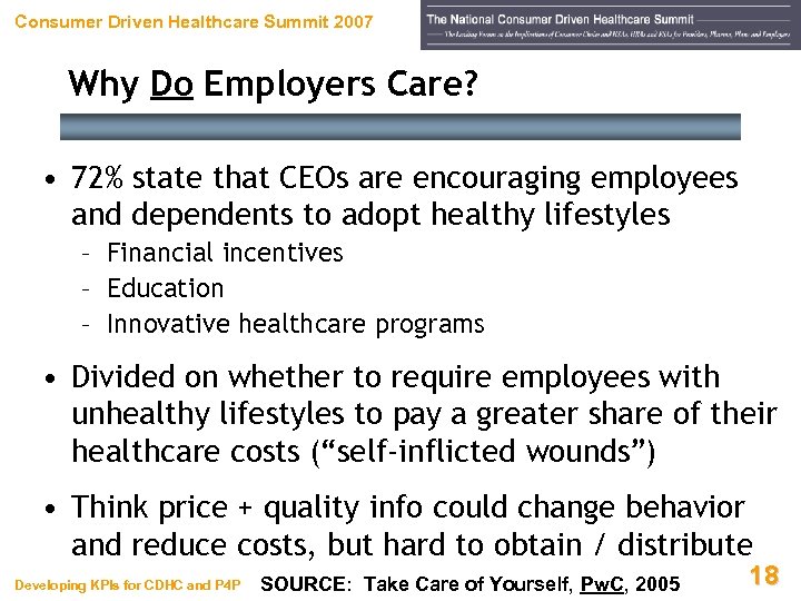 Consumer Driven Healthcare Summit 2007 Why Do Employers Care? • More than 75% believe they can reduce benefit costs by making employees pay a greater share • Nearly 67% fear that increasing deductibles could cause employees to defer needed care or risk long -term health problems • This could reduce productivity and lead to higher catastrophic costs later • 80% believe most-promising option is to provide financial incentives for employees to adopt healthier lifestyles (“carrot vs. stick”) Developing KPIs for CDHC and P 4 P SOURCE: Take Care of Yourself, Pw. C, 2005 17