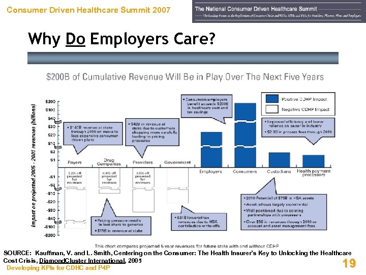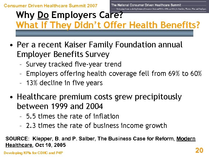 Consumer Driven Healthcare Summit 2007 Why Do Employers Care? SOURCE: Kauffman, V. and L. Smith, Centering on the Consumer: The Health Insurer’s Key to Unlocking the Healthcare Cost Crisis, Diamond. Cluster International, 2005 Developing KPIs for CDHC and P 4 P 19