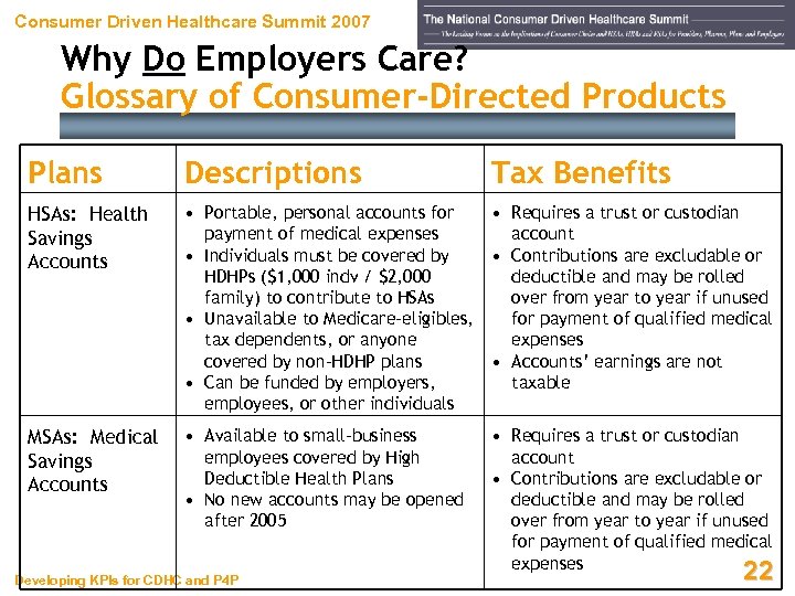 Consumer Driven Healthcare Summit 2007 Why Do Employers Care? Glossary of Consumer-Directed Products Plans Descriptions Tax Benefits FSAs: Flexible Spending Accounts • Employer bookkeeping accts for medical expenses, funded by employee pre-tax dollars • Often offered as separate components of cafeteria plans • Unspent balances may not be rolled over from year to year or cashed out • “Use it or lose it” HDHPs: High. Deductible Health Plans • Health insurance plans with a • Tax benefits same as other deductible of at least $1, 000 employer plans • Must meet certain legislative • Premiums are tax deductions for and regulatory requirements for employers and are not considered participants to contribute to taxable income for employees HSAs and MSAs • Medical plans funded entirely by • Unspent balances may be rolled HRAs: Health employers, that reimburse over from year to year but there Reimbursement employees for qualified medical is only limited portability Arrangements expenses • Cannot be offered through cafeteria plans Developing KPIs for CDHC and P 4 P • Unused amounts cannot be cashed out 21