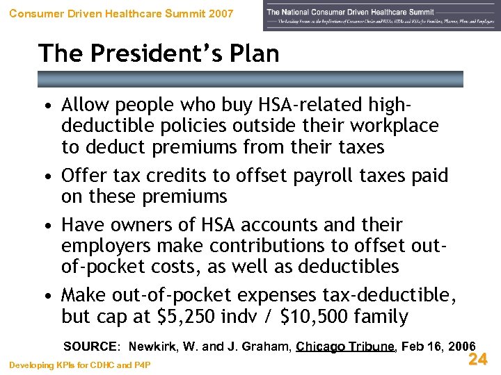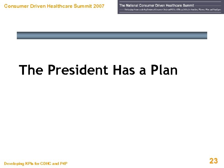 Consumer Driven Healthcare Summit 2007 The President Has a Plan Developing KPIs for CDHC and P 4 P 23