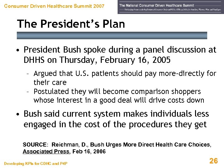 Consumer Driven Healthcare Summit 2007 The President’s Plan • “Refundable” tax credit to help uninsured Americans purchase high-deductible policies in connection with HSAs • Maximum credit – $1, 000 for one adult – $2, 000 for two adults – $3, 000 for two adults with children • Credit would phase out at – $30, 000+ income for individuals – $60, 000+ income for families SOURCE: Newkirk, W. and J. Graham, Chicago Tribune, Feb 16, 2006 Developing KPIs for CDHC and P 4 P 25