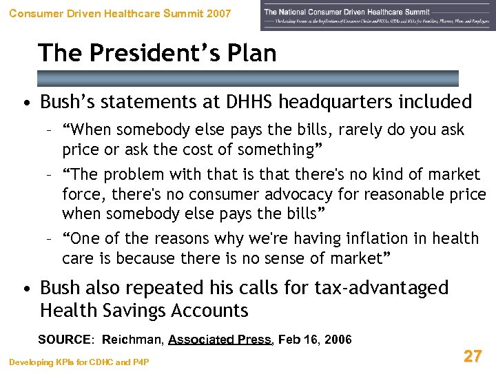 Consumer Driven Healthcare Summit 2007 The President’s Plan • President Bush spoke during a panel discussion at DHHS on Thursday, February 16, 2005 – Argued that U. S. patients should pay more-directly for their care – Postulated they will become comparison shoppers whose interest in a good deal will drive costs down • Bush said current system makes individuals less engaged in the cost of the procedures they get SOURCE: Reichman, D. , Bush Urges More Direct Health Care Choices, Associated Press, Feb 16, 2006 Developing KPIs for CDHC and P 4 P 26