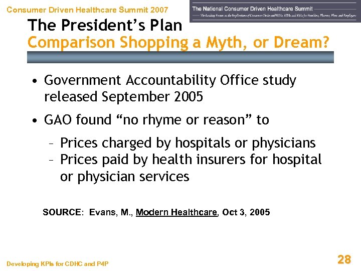 Consumer Driven Healthcare Summit 2007 The President’s Plan • Bush’s statements at DHHS headquarters included – “When somebody else pays the bills, rarely do you ask price or ask the cost of something” – “The problem with that is that there's no kind of market force, there's no consumer advocacy for reasonable price when somebody else pays the bills” – “One of the reasons why we're having inflation in health care is because there is no sense of market” • Bush also repeated his calls for tax-advantaged Health Savings Accounts SOURCE: Reichman, Associated Press, Feb 16, 2006 Developing KPIs for CDHC and P 4 P 27