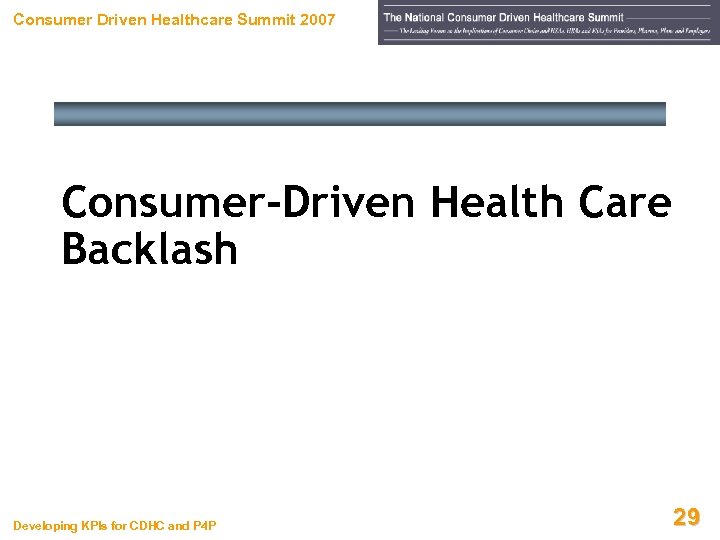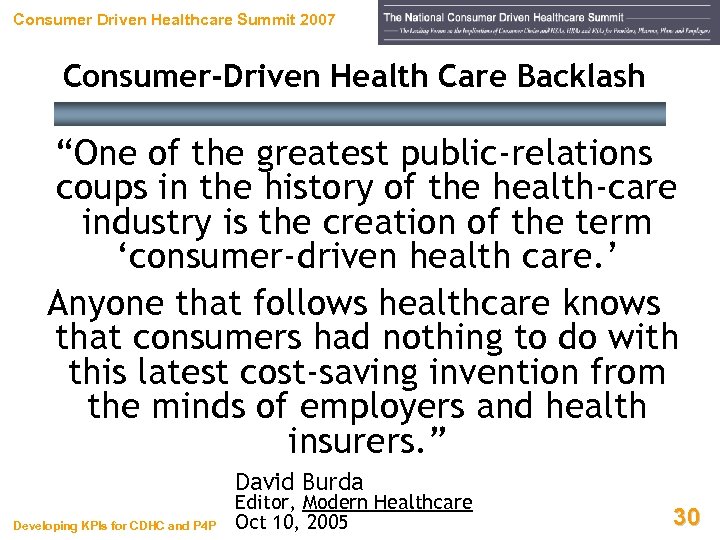 Consumer Driven Healthcare Summit 2007 Consumer-Driven Health Care Backlash Developing KPIs for CDHC and P 4 P 29
