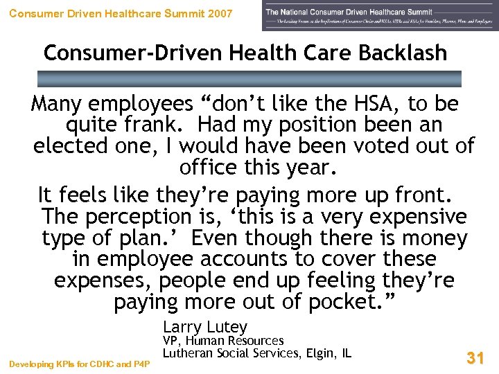 Consumer Driven Healthcare Summit 2007 Consumer-Driven Health Care Backlash “One of the greatest public-relations coups in the history of the health-care industry is the creation of the term ‘consumer-driven health care. ’ Anyone that follows healthcare knows that consumers had nothing to do with this latest cost-saving invention from the minds of employers and health insurers. ” David Burda Developing KPIs for CDHC and P 4 P Editor, Modern Healthcare Oct 10, 2005 30