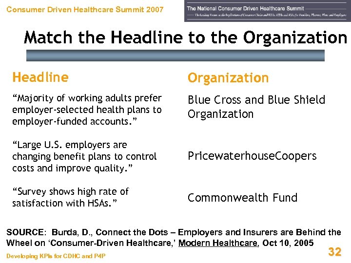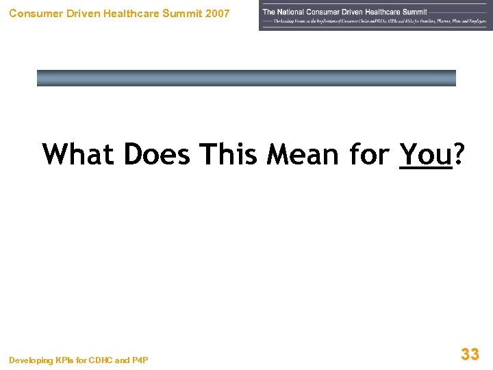 Consumer Driven Healthcare Summit 2007 Match the Headline to the Organization Headline Organization “Majority of working adults prefer employer-selected health plans to employer-funded accounts. ” Blue Cross and Blue Shield Organization “Large U. S. employers are changing benefit plans to control costs and improve quality. ” Pricewaterhouse. Coopers “Survey shows high rate of satisfaction with HSAs. ” Commonwealth Fund SOURCE: Burda, D. , Connect the Dots – Employers and Insurers are Behind the Wheel on ‘Consumer-Driven Healthcare, ’ Modern Healthcare, Oct 10, 2005 Developing KPIs for CDHC and P 4 P 32