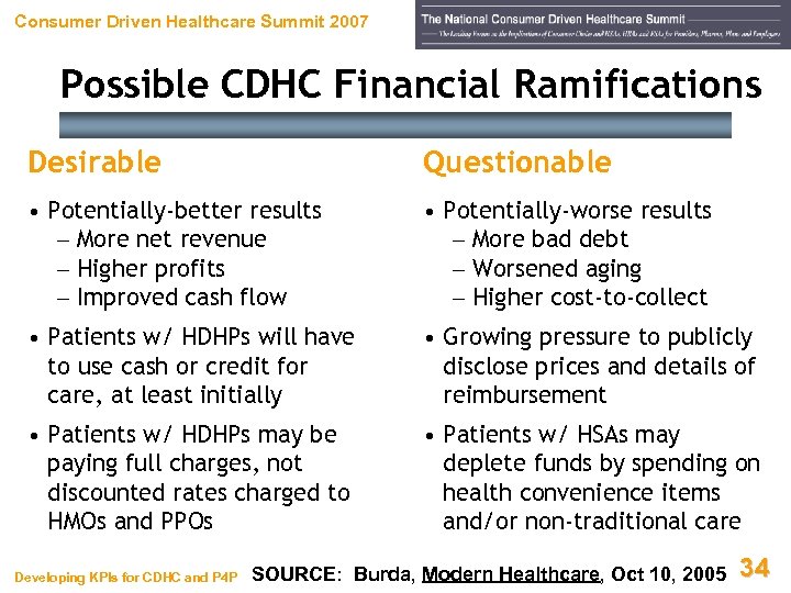 Consumer Driven Healthcare Summit 2007 Agenda (cont’d) • Pay-For-Performance – – – Costs of Errors and Variation How Can They Pay Us for “Quality? ” Challenges Ahead Backlash Keys to Success Under P 4 P • KPIs for CDHC and P 4 P – – Scheduling Pre-Registration / Pre-Authorization Insurance Verification Patient Access / Registration Developing KPIs for CDHC and P 4 P 33