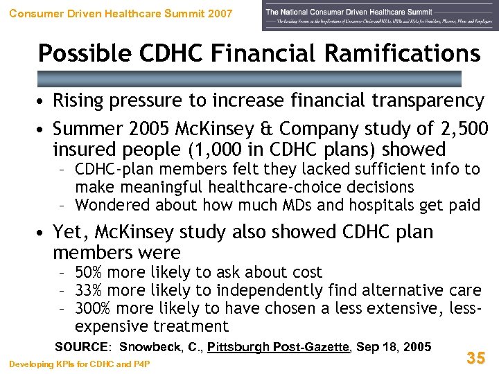 Consumer Driven Healthcare Summit 2007 Possible CDHC Financial Ramifications Desirable Questionable • Potentially-better results – More net revenue – Higher profits – Improved cash flow • Potentially-worse results – More bad debt – Worsened aging – Higher cost-to-collect • Patients w/ HDHPs will have to use cash or credit for care, at least initially • Growing pressure to publicly disclose prices and details of reimbursement • Patients w/ HDHPs may be paying full charges, not discounted rates charged to HMOs and PPOs • Patients w/ HSAs may deplete funds by spending on health convenience items and/or non-traditional care Developing KPIs for CDHC and P 4 P SOURCE: Burda, Modern Healthcare, Oct 10, 2005 34