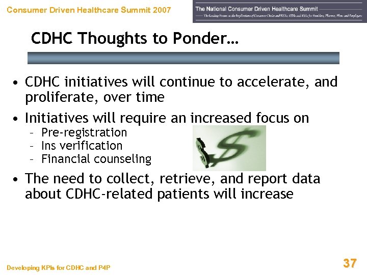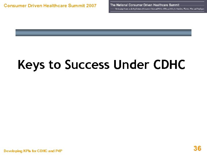 Consumer Driven Healthcare Summit 2007 Keys to Success Under CDHC Developing KPIs for CDHC and P 4 P 36