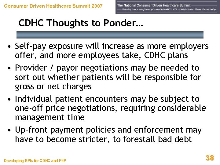 Consumer Driven Healthcare Summit 2007 CDHC Thoughts to Ponder… • CDHC initiatives will continue to accelerate, and proliferate, over time • Initiatives will require an increased focus on – Pre-registration – Ins verification – Financial counseling • The need to collect, retrieve, and report data about CDHC-related patients will increase Developing KPIs for CDHC and P 4 P 37