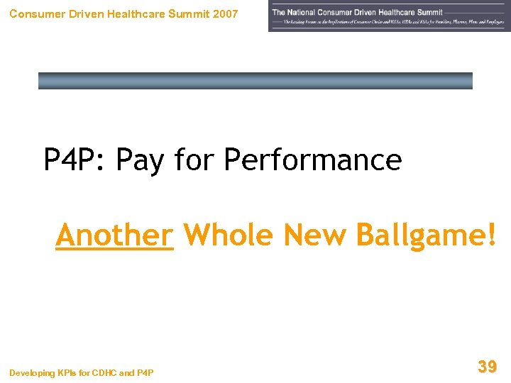 Consumer Driven Healthcare Summit 2007 P 4 P: Pay for Performance Another Whole New Ballgame! Developing KPIs for CDHC and P 4 P 39