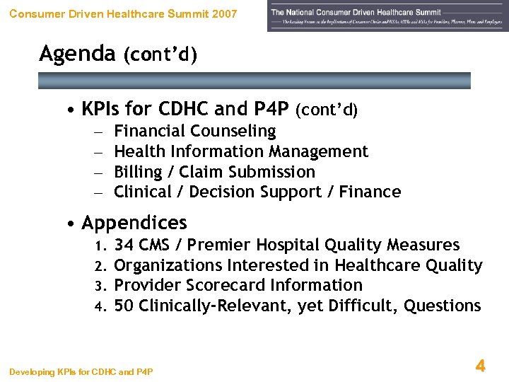 Consumer Driven Healthcare Summit 2007 Appendices Developing KPIs for CDHC and P 4 P 103