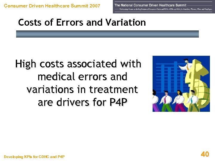Consumer Driven Healthcare Summit 2007 Costs of Errors and Variation High costs associated with medical errors and variations in treatment are drivers for P 4 P Developing KPIs for CDHC and P 4 P 40